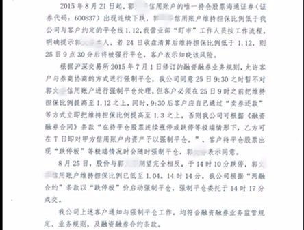 另外,郭女士還介紹,按照融資融券合同規(guī)定,太平洋證券有權(quán)平倉(cāng)的最早時(shí)間為T+2日,T日為24日,而T+2日即26日,而非25日。此外,太平洋證券的強(qiáng)平并未提前通知郭女士,按照約定太平洋證券應(yīng)于21日對(duì)其進(jìn)行平倉(cāng)通知。