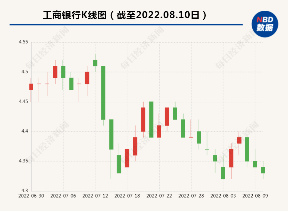 截至8月10日收盤,工商銀行報(bào)4.33元/股,當(dāng)日跌幅0.23%。