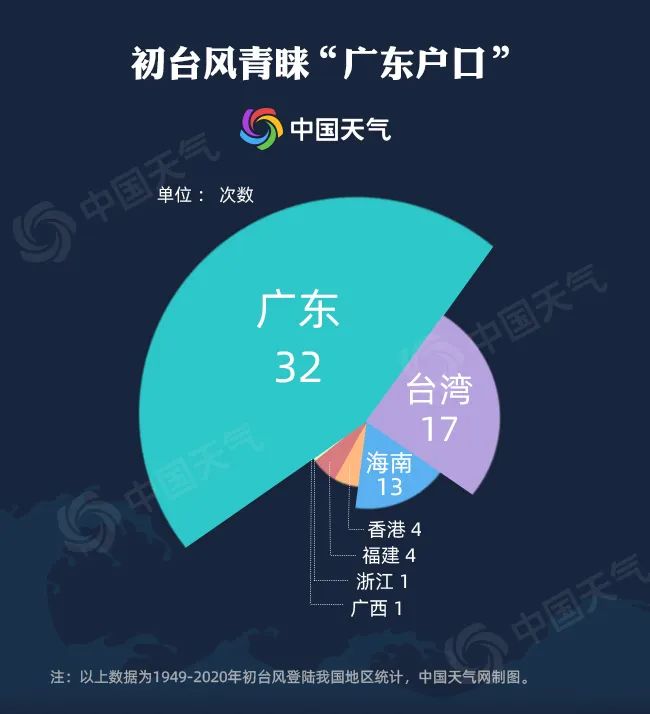從初臺(tái)風(fēng)登陸地來看,北至浙江寧海到三門一線,南達(dá)海南三亞,均能“捕捉”初臺(tái)風(fēng)的身影。不過,統(tǒng)計(jì)顯示,初臺(tái)風(fēng)扎堆的登陸點(diǎn)是廣東、臺(tái)灣和海南三省,其中廣東最受青睞。