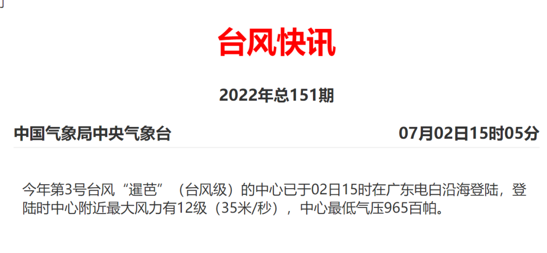 今年第3號臺(tái)風(fēng)“暹芭”的中心已于今日(7月2日)15時(shí)前后在廣東電白登陸,成為今年來登陸我國的首個(gè)臺(tái)風(fēng)。
