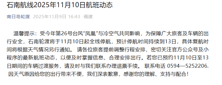 受氣候因素影響,廈金、泉金航線11月10日(周一)停航,復(fù)航時(shí)間另行通知。請(qǐng)旅客關(guān)注氣象信息,提前做好行程安排。
