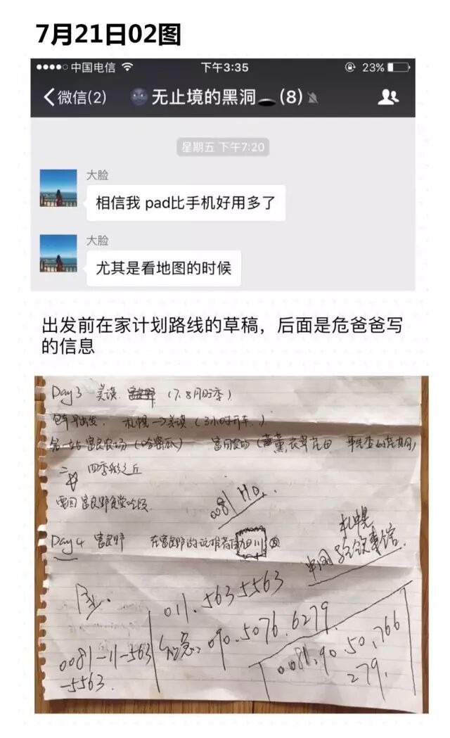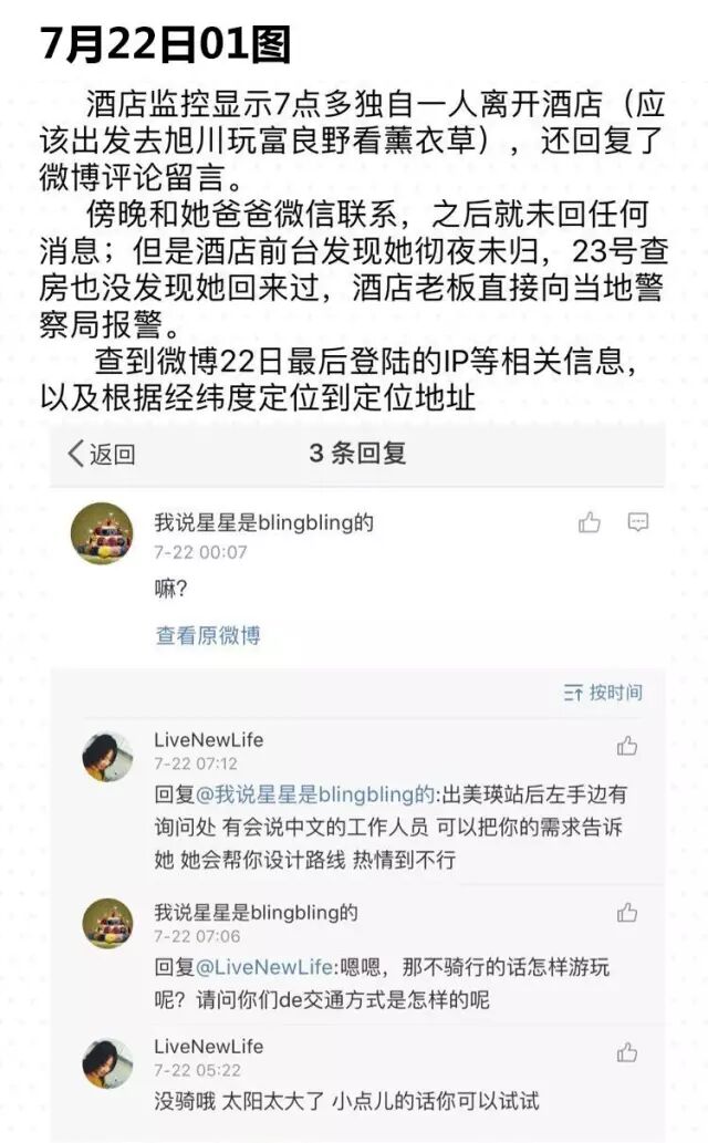 7月16日,危秋潔離開家后先到福州,之后到天津乘坐飛機,18日抵達日本函館機場。旅行的前幾天,危秋潔一直保持與家人、朋友聯(lián)系,聊天內(nèi)容沒有異常。22日傍晚四五點(北京時間),危秋潔與父親微信閑聊,父親問她有沒有回酒店,危秋潔回答“有”。之后至今,危秋潔與家人再也沒有聯(lián)系。23日,危秋潔為一條零點發(fā)送的“孫燕姿生日送祝福”的微博點了贊,之后她的微博沒有任何動態(tài)消息。