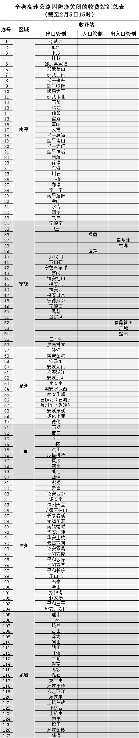 自2020年2月6日0時00分起,臨時關(guān)閉涵江的萩蘆收費站、荔城的北高收費站、北岸的忠門收費站和仙游的蓋尾、榜頭、游洋收費站。