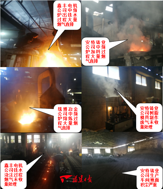 周寧縣獅城鎮(zhèn)龍?zhí)洞宀糠骤T造企業(yè),因距離居民區(qū)近且存在污染擾民問題,在第二輪中央生態(tài)環(huán)境保護(hù)督察期間已被群眾投訴,周寧縣雖然制定了鑄造行業(yè)整體搬遷方案,并計(jì)劃在2021年前完成整體搬遷,但在搬遷過(guò)渡時(shí)期部分企業(yè)持續(xù)違法排污,周邊群眾反映強(qiáng)烈。8月13日,省生態(tài)環(huán)境廳執(zhí)法人員現(xiàn)場(chǎng)抽查周寧縣鑫豐電機(jī)有限公司(工業(yè)南一路36號(hào))、周寧縣安特鑄業(yè)有限公司(工業(yè)南一路29號(hào)和40號(hào))、周寧縣縱博冶金制品有限公司(工業(yè)南一路52號(hào))三家鑄造企業(yè),發(fā)現(xiàn)中頻爐集氣罩均形同虛設(shè),中頻爐加料、熔煉、出鐵水過(guò)程大量煙氣逸散直排;樹脂模具制作、砂料模具成型、鐵水澆注等工序均未配套環(huán)保處理設(shè)施,大量廢氣和粉塵無(wú)組織排放,生產(chǎn)車間地面積塵嚴(yán)重。