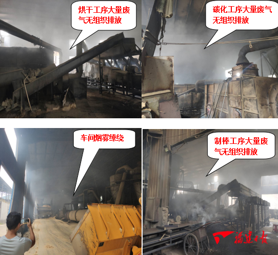 企業(yè)位于邵武市下沙鎮(zhèn),主要從事機(jī)制炭生產(chǎn),因廢氣擾民被群眾投訴。8月7日,省生態(tài)環(huán)境廳執(zhí)法人員現(xiàn)場(chǎng)檢查發(fā)現(xiàn),該公司正在生產(chǎn),炭化、制棒、烘干等工序的生產(chǎn)設(shè)備和集氣管道均有破損,大量的木炭煙氣未經(jīng)處理無(wú)組織排放,車間煙霧繚繞。