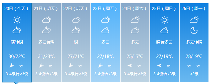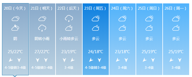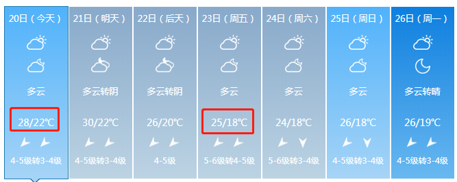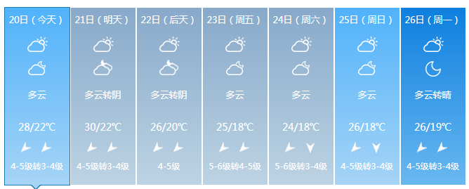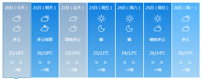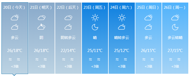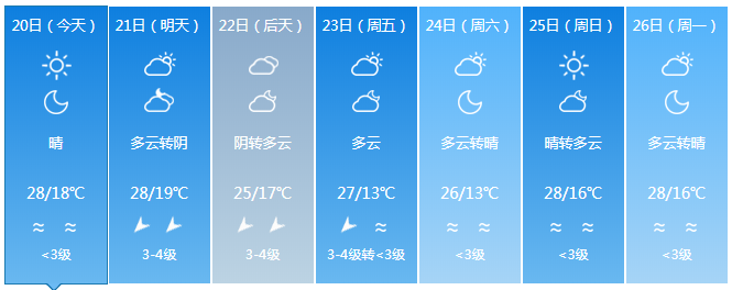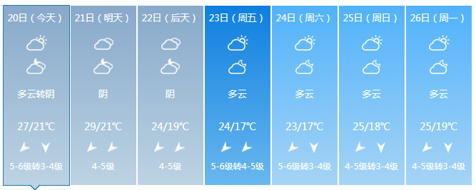 23~28日,低層受偏北到偏東氣流影響,全省以多云天氣為主。