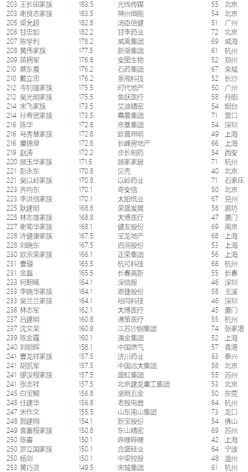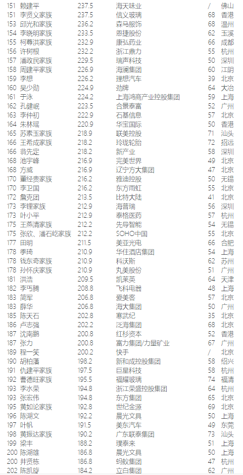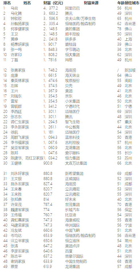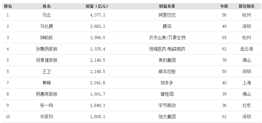 排在前10位的中國(guó)富豪分別是:馬云、馬化騰、鐘睒睒、孫飄揚(yáng)家族、何享健家族、王衛(wèi)、黃崢、楊惠妍家族、張一鳴、許家印。