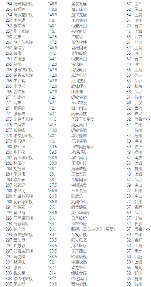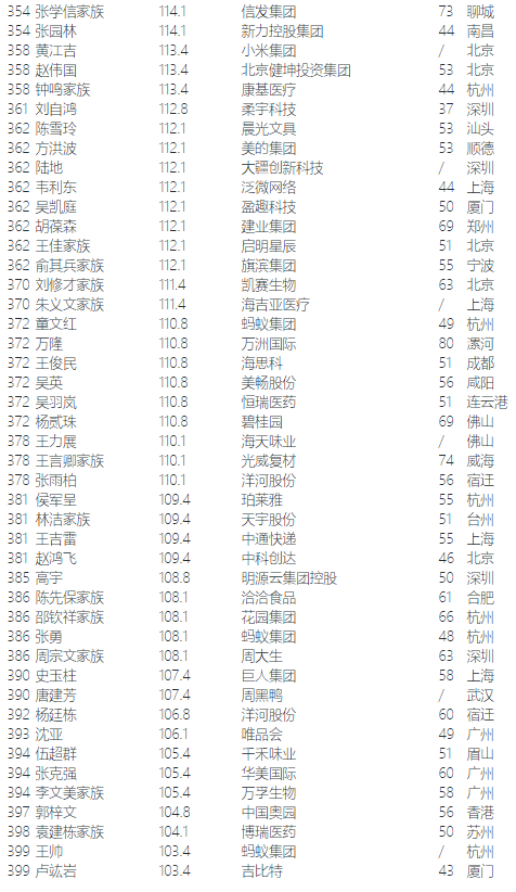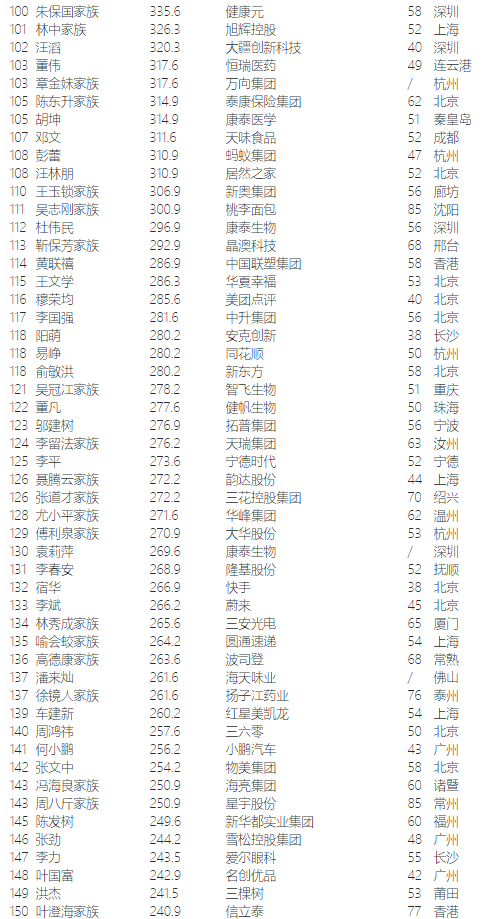 字節(jié)跳動(dòng)張一鳴(1848.3億元)、美團(tuán)點(diǎn)評(píng)王興(1367.9億元)、寧德時(shí)代曾毓群(1341.2億元)、世茂集團(tuán)許榮茂(787.4億元)、美團(tuán)點(diǎn)評(píng)張濤(647.2億元)、寧德時(shí)代黃世霖(607.2億億元)、達(dá)利食品許世輝家族(593.9億元)、 安踏體育丁世忠(459.7億元)、安踏體育丁世家(452.4億元)、寧德時(shí)代裴振華(344.3億元)。