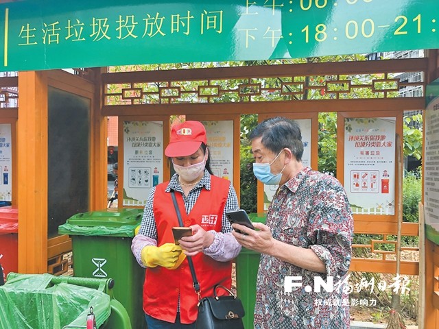 寧德市華僑新村小區(qū)分類垃圾管理員為正確分類投放垃圾的居民登記積分。閩東日報(bào) 龔鍵榮 攝