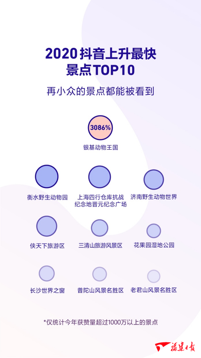 報告顯示,疫情得到有效控制后,抖音見證了全國旅游經(jīng)濟(jì)的復(fù)蘇。2020年國慶,抖音全國景點(diǎn)日均打卡量超過春節(jié)10倍。武漢成為年度獲贊最多的城市,超過83億次,北京和成都分列二三位。越來越多原先不知名的景點(diǎn),因抖音被更多人看到——河南鄭州銀基動物王國成為2020抖音上升最快的熱門景點(diǎn),獲贊量漲幅超過3086%;福建三明俠天下旅游區(qū)、河南洛陽老君山風(fēng)景名勝區(qū)等小眾景點(diǎn)均通過抖音走紅,獲贊超過千萬,躋身年度上升最快景點(diǎn)前10。