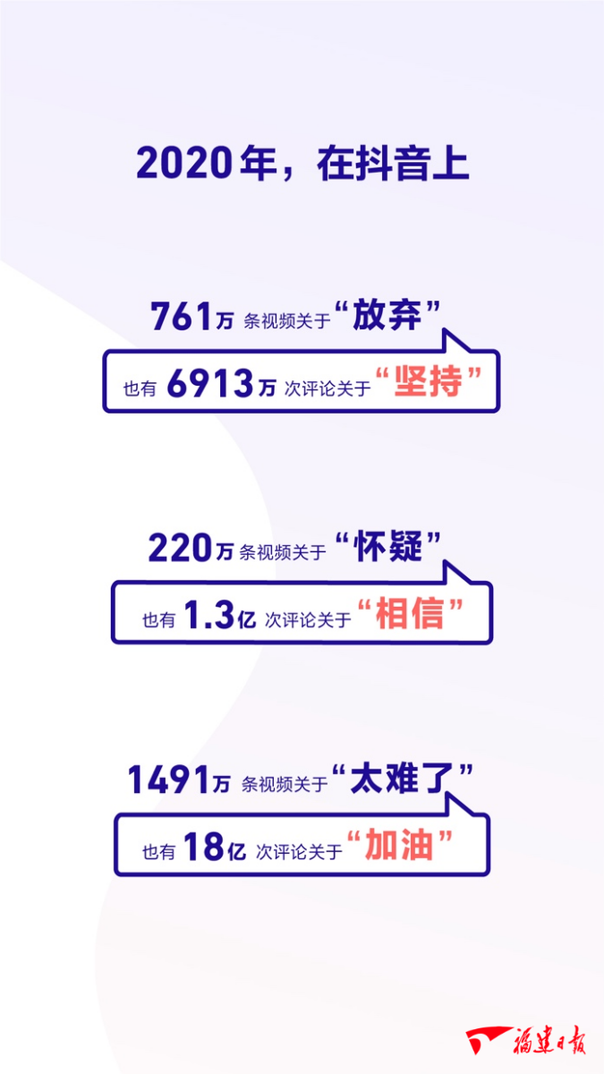 在這個特殊的年份,抖音用戶共發(fā)布了761萬條關(guān)于“放棄”的視頻,220萬條關(guān)于“懷疑”的視頻和1491萬條關(guān)于“太難了”的視頻。但積極樂觀的情緒仍然占據(jù)上風(fēng),報告統(tǒng)計,抖音用戶全年分別發(fā)布了6913萬條、1.3億條、18億條關(guān)于“堅持”、“相信”和“加油”的評論。