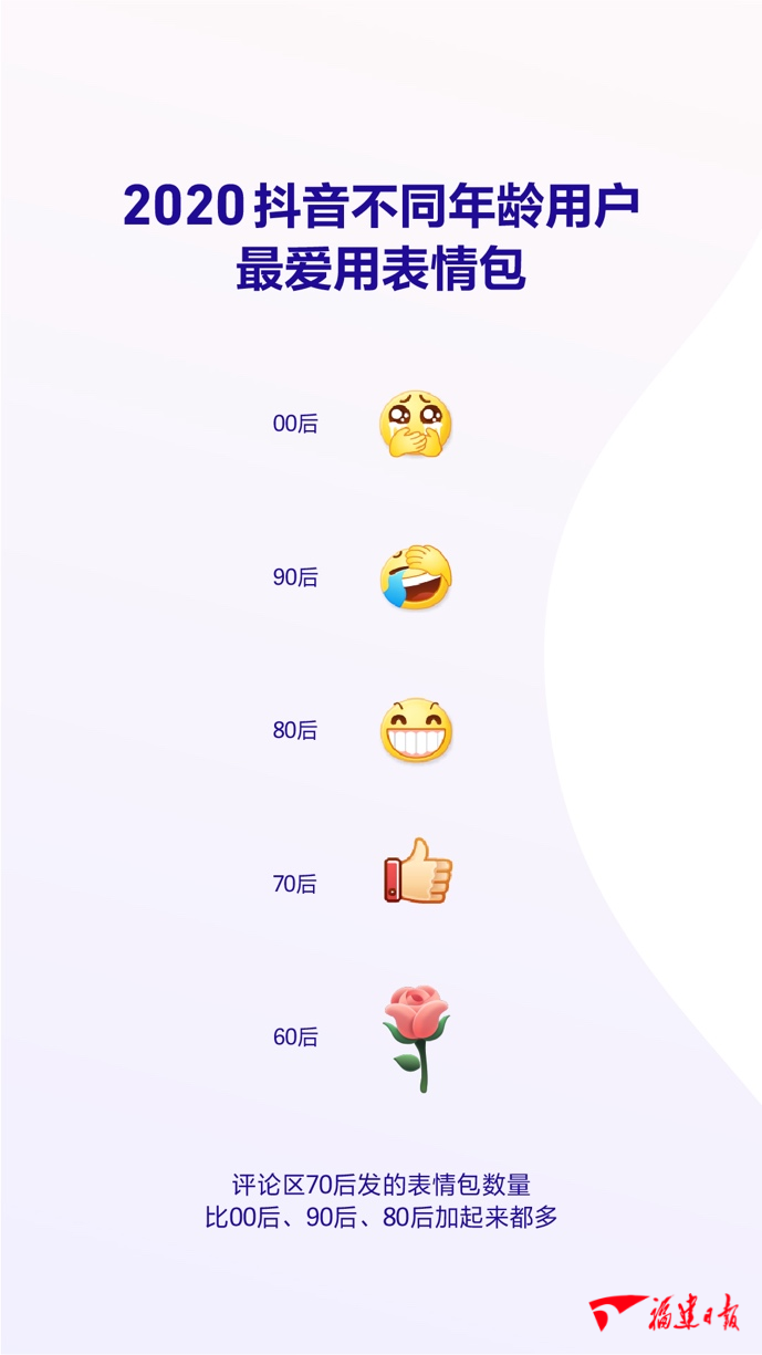 從年齡段看,90后用戶逐漸結(jié)婚生子,最喜歡記錄親子日常,80后最愛拍攝風(fēng)景,70后最喜歡拍攝美食,60后則更喜歡拍攝舞蹈。除了拍攝視頻類型不同,不同年齡段人群也有各自鐘愛的抖音表情。00后最愛用的表情包是“泣不成聲”,90后最愛“捂臉”表達(dá)哭笑不得,80后最愛用“呲牙”。70后、60后則分別最喜歡用“贊”和“玫瑰”。值得注意的是,評論區(qū)70后發(fā)的表情包數(shù)量,比00后、90后、80后加起來都多。這表明中老年用戶正在通過抖音積極表達(dá)。 (記者 林侃)