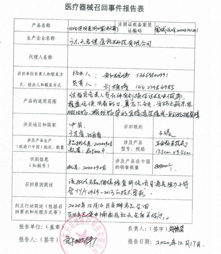 對(duì)一次性使用醫(yī)用口罩主動(dòng)召回