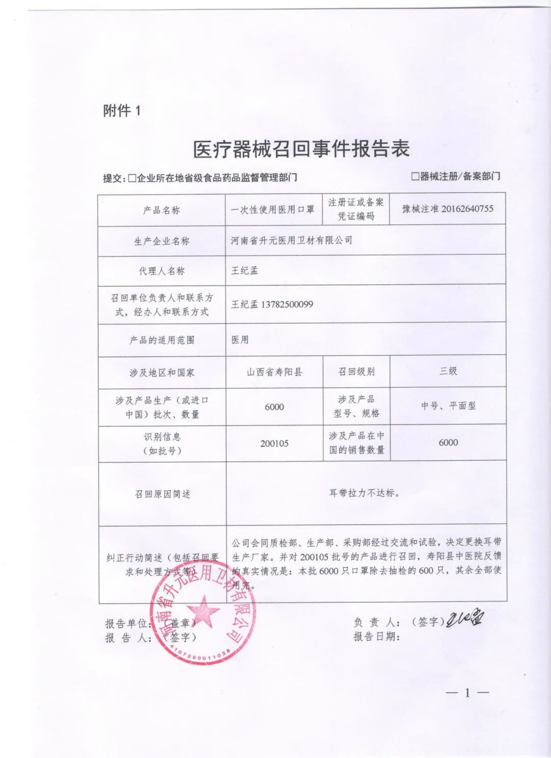 河南省升元醫(yī)用衛(wèi)材有限公司報(bào)告,由于其生產(chǎn)的一批次一次性使用醫(yī)用口罩口罩帶拉力不符合規(guī)定,企業(yè)對(duì)其主動(dòng)召回,召回級(jí)別為三級(jí)。