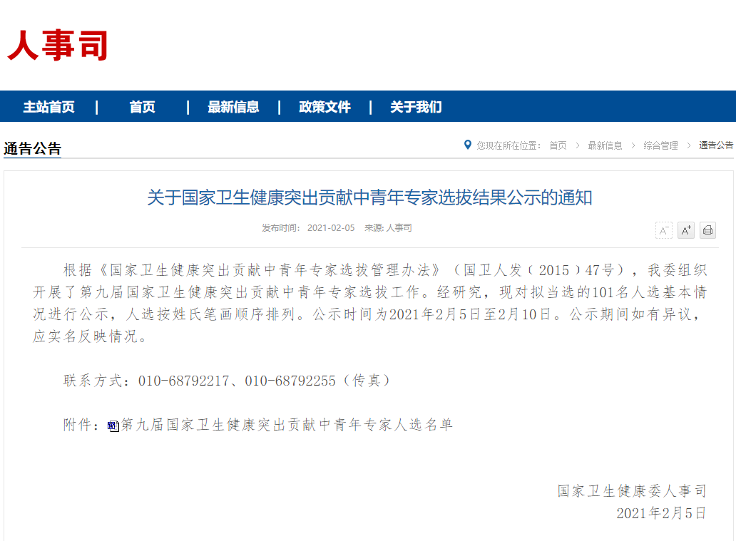 國家衛(wèi)健委網(wǎng)站2月5日發(fā)布關(guān)于國家衛(wèi)生健康突出貢獻(xiàn)中青年專家選拔結(jié)果公示的通知。