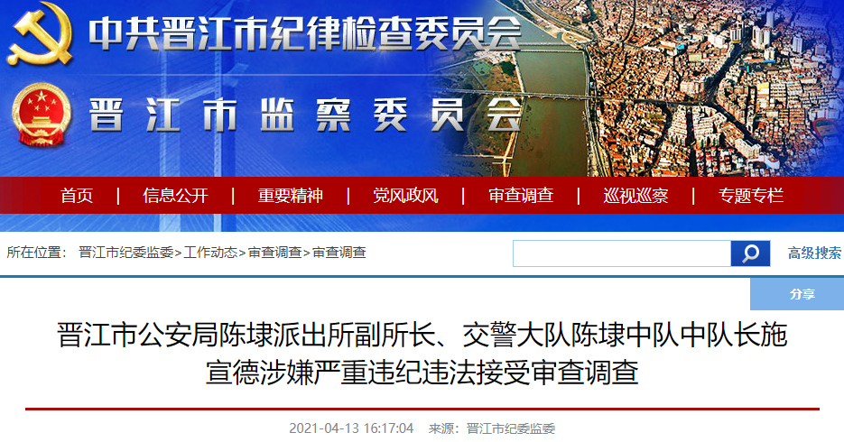 晉江市公安局陳埭派出所副所長、交警大隊陳埭中隊中隊長施宣德被查