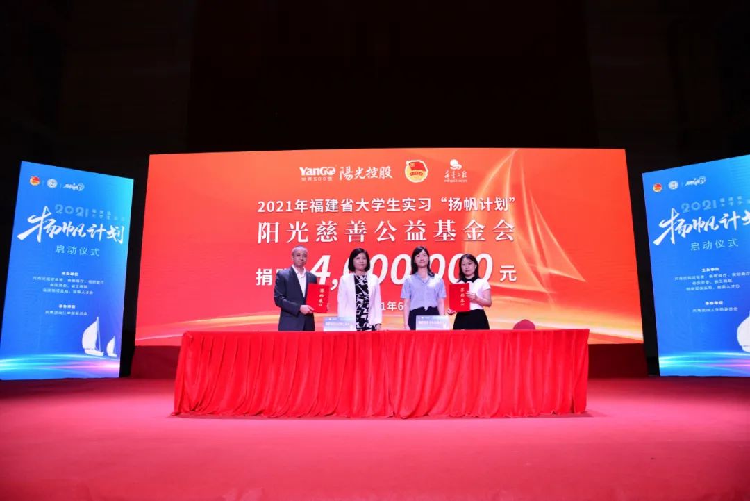 啟動(dòng)儀式現(xiàn)場(chǎng),福建省青少年發(fā)展基金會(huì)和福建省陽(yáng)光慈善公益基金會(huì)共同簽訂了“揚(yáng)帆計(jì)劃”捐贈(zèng)協(xié)議,陽(yáng)光控股有限公司將捐贈(zèng)400萬元,其中設(shè)立了超過260萬獎(jiǎng)學(xué)金用于獎(jiǎng)勵(lì)優(yōu)秀實(shí)習(xí)生;省委人才辦和共青團(tuán)福建省委共同發(fā)送了《致省外優(yōu)秀閩籍學(xué)子的一封信》。