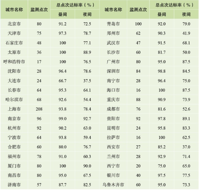 達(dá)標(biāo)率數(shù)據(jù)如何得出?報(bào)告顯示,2020年,全國(guó)共有311個(gè)地級(jí)及以上城市報(bào)送了功能區(qū)聲環(huán)境質(zhì)量監(jiān)測(cè)數(shù)據(jù),各類功能區(qū)共監(jiān)測(cè)23546點(diǎn)次,晝間、夜間各11773點(diǎn)次。晝間共有11143個(gè)監(jiān)測(cè)點(diǎn)次達(dá)標(biāo),達(dá)標(biāo)率為94.6%;夜間共有9427個(gè)監(jiān)測(cè)點(diǎn)次達(dá)標(biāo),達(dá)標(biāo)率為80.1%。