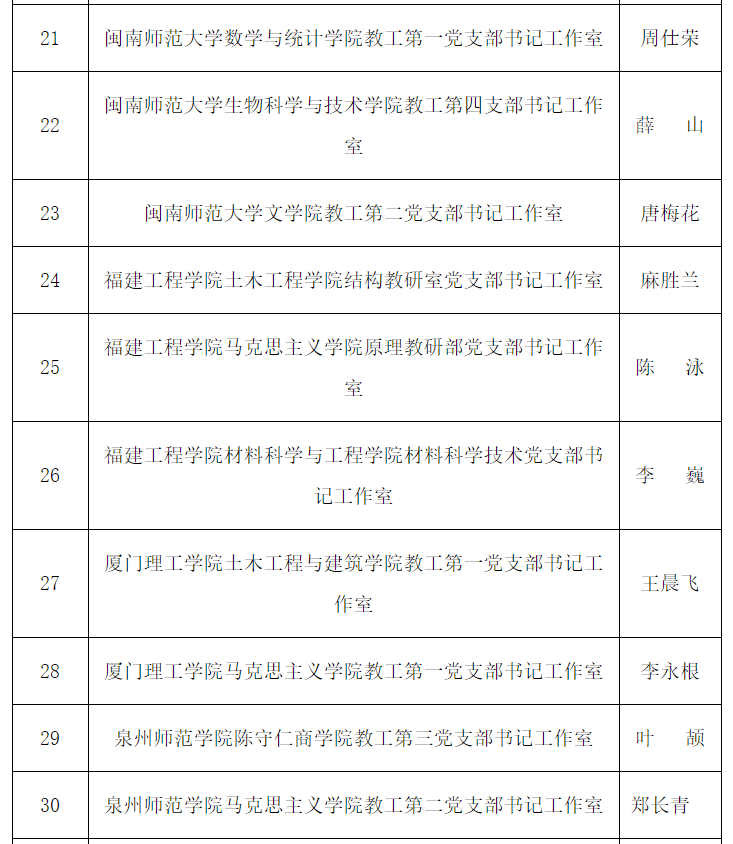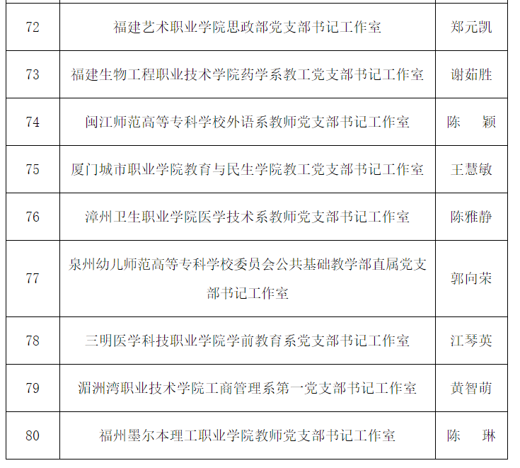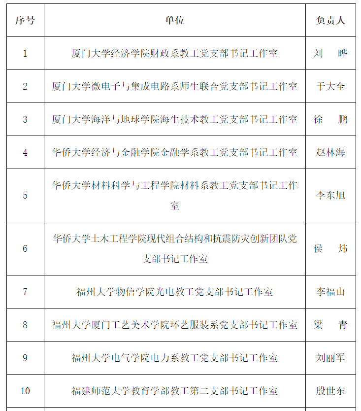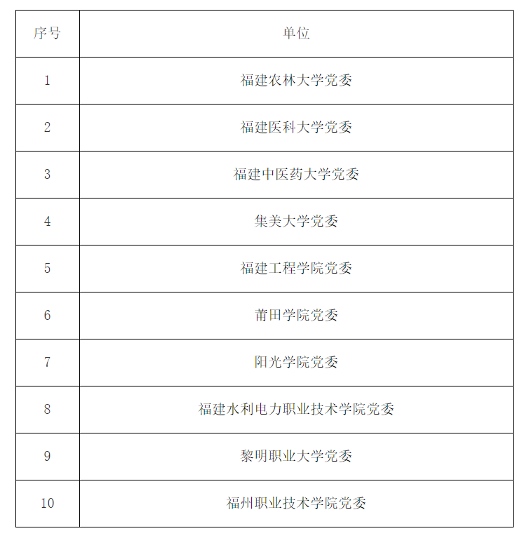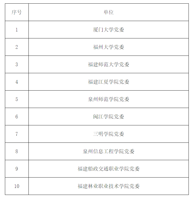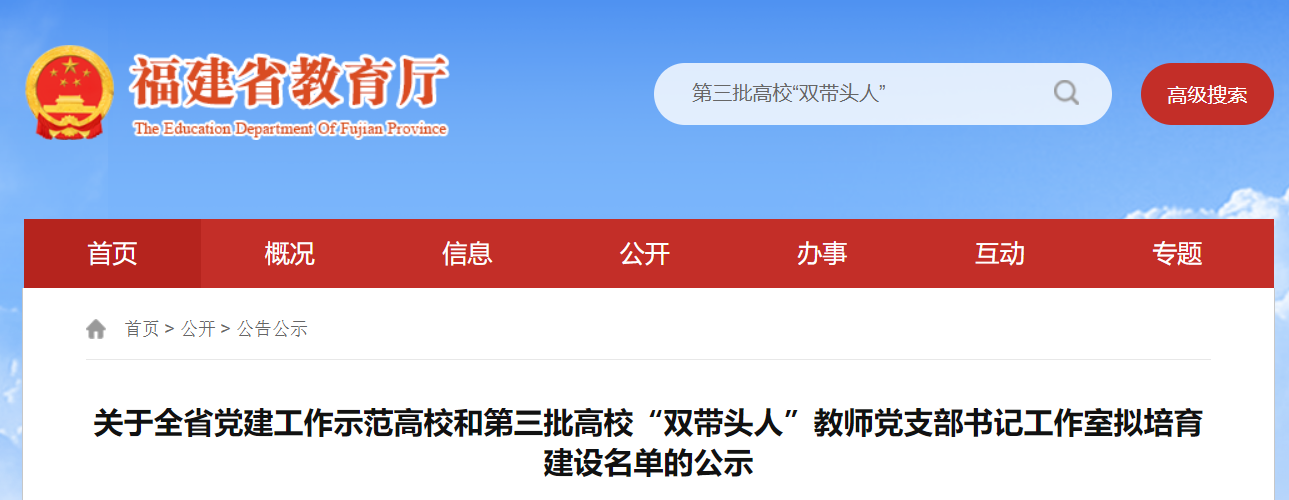 根據(jù)《中共福建省委教育工委辦公室關(guān)于持續(xù)推進(jìn)新時(shí)代高校黨建示范創(chuàng)建和質(zhì)量創(chuàng)優(yōu)工作的通知》(閩委教辦組〔2021〕1號)精神,經(jīng)各高校黨委推薦、省委教育工委研究,遴選產(chǎn)生了10個(gè)黨建示范高校、10個(gè)黨建工作示范培育創(chuàng)建高校、80個(gè)第三批高校“雙帶頭人”教師黨支部書記工作室,現(xiàn)就擬培育建設(shè)名單予以公示。公示時(shí)間:2021年7月5日-9日。