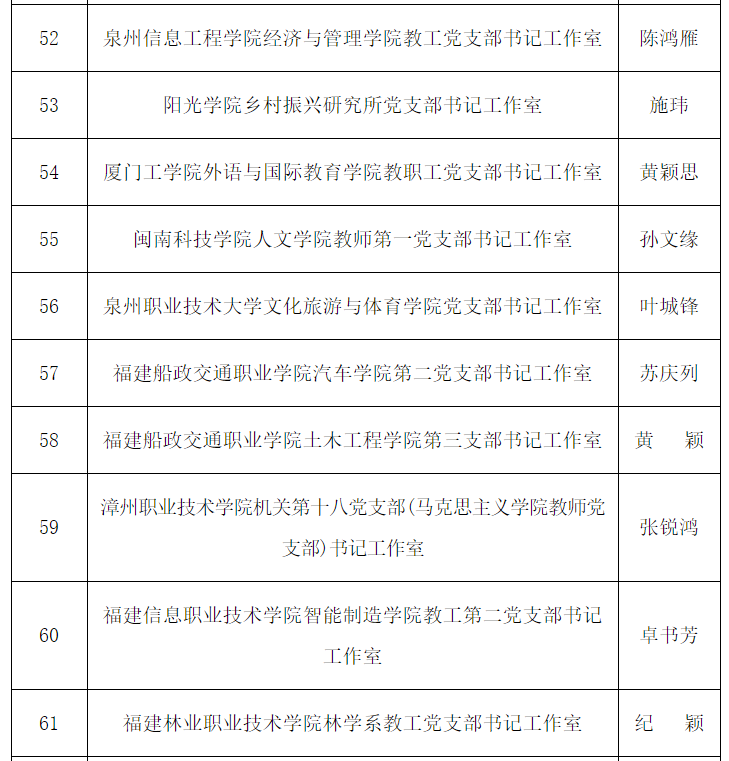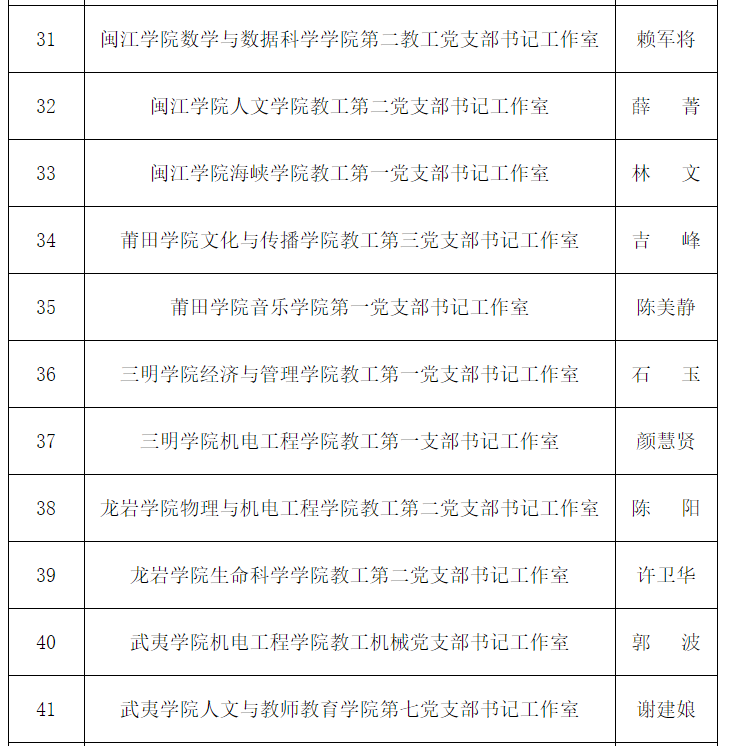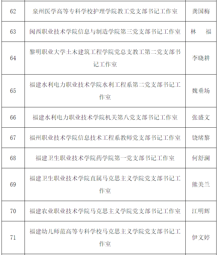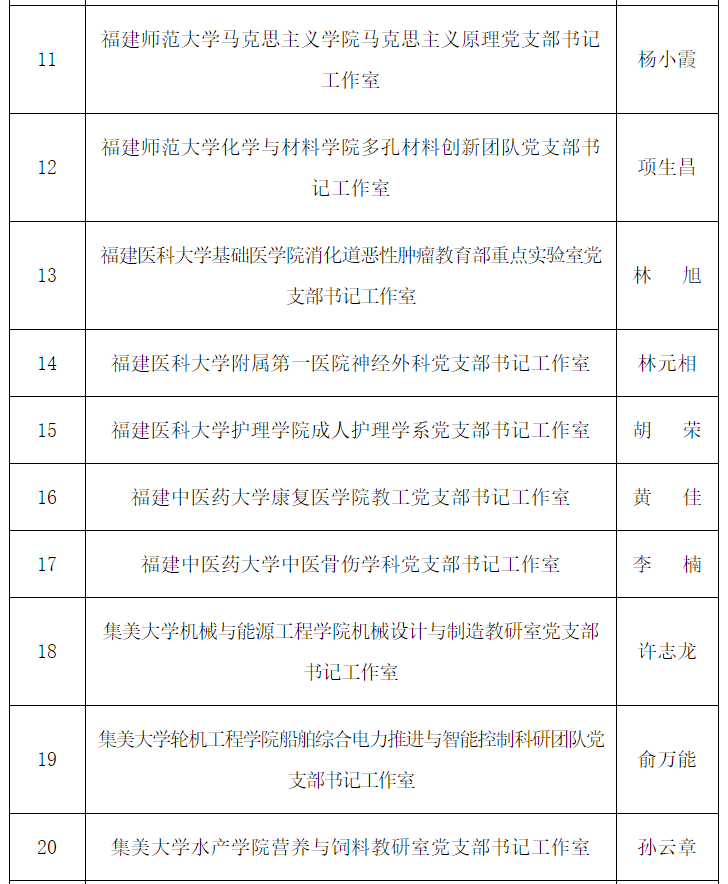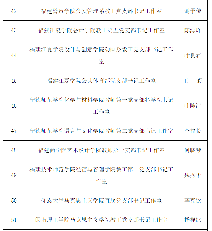 根據(jù)《中共福建省委教育工委辦公室關(guān)于持續(xù)推進(jìn)新時(shí)代高校黨建示范創(chuàng)建和質(zhì)量創(chuàng)優(yōu)工作的通知》(閩委教辦組〔2021〕1號)精神,經(jīng)各高校黨委推薦、省委教育工委研究,遴選產(chǎn)生了10個(gè)黨建示范高校、10個(gè)黨建工作示范培育創(chuàng)建高校、80個(gè)第三批高校“雙帶頭人”教師黨支部書記工作室,現(xiàn)就擬培育建設(shè)名單予以公示。公示時(shí)間:2021年7月5日-9日。