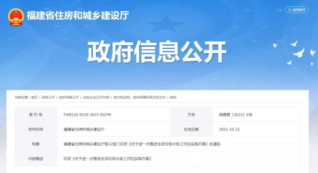 近日,福建省住房和城鄉(xiāng)建設(shè)廳等12部門印發(fā)《關(guān)于進(jìn)一步推進(jìn)生活垃圾分類工作的實(shí)施方案》的通知。明確到2021年底前全省各設(shè)區(qū)市基本建成生活垃圾分類處理體系。