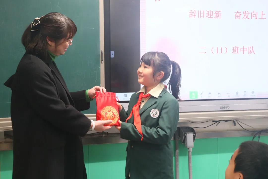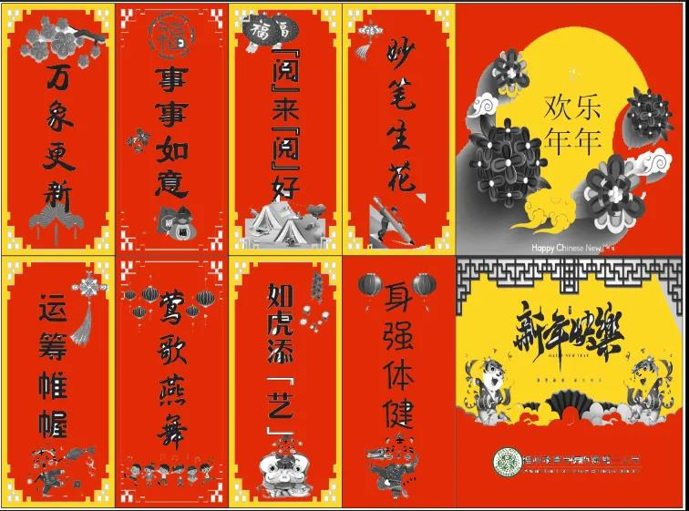 打開福袋,是一張大卡片,寫滿教師對全體學(xué)生的祝福。祝福內(nèi)容包含“新年快樂”“歡樂年年”“萬象更新”“事事如意”“閱來閱好”“妙筆生花”“運籌帷幄”“鶯歌燕舞”“如虎添藝”“身強體健”共十個方面,寓意“十全十美”。