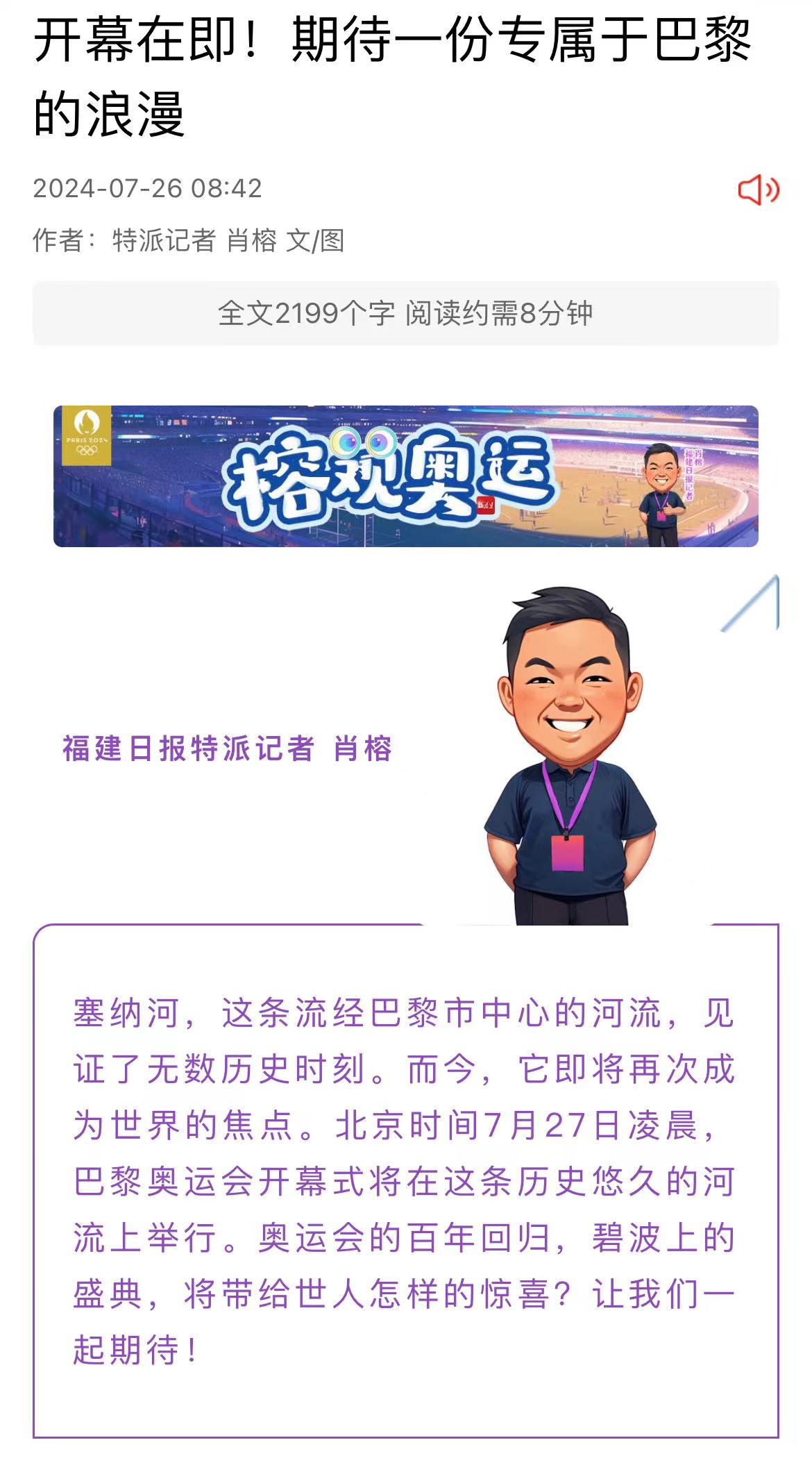 7月24日,福建日報特派記者肖榕啟程前往法國巴黎,抵達巴黎后的奧運首秀原創(chuàng)vlog短視頻《福建的風吹到了巴黎!》揭開了本次奧運報道的序章。