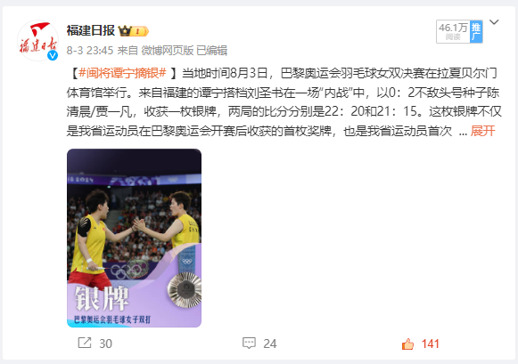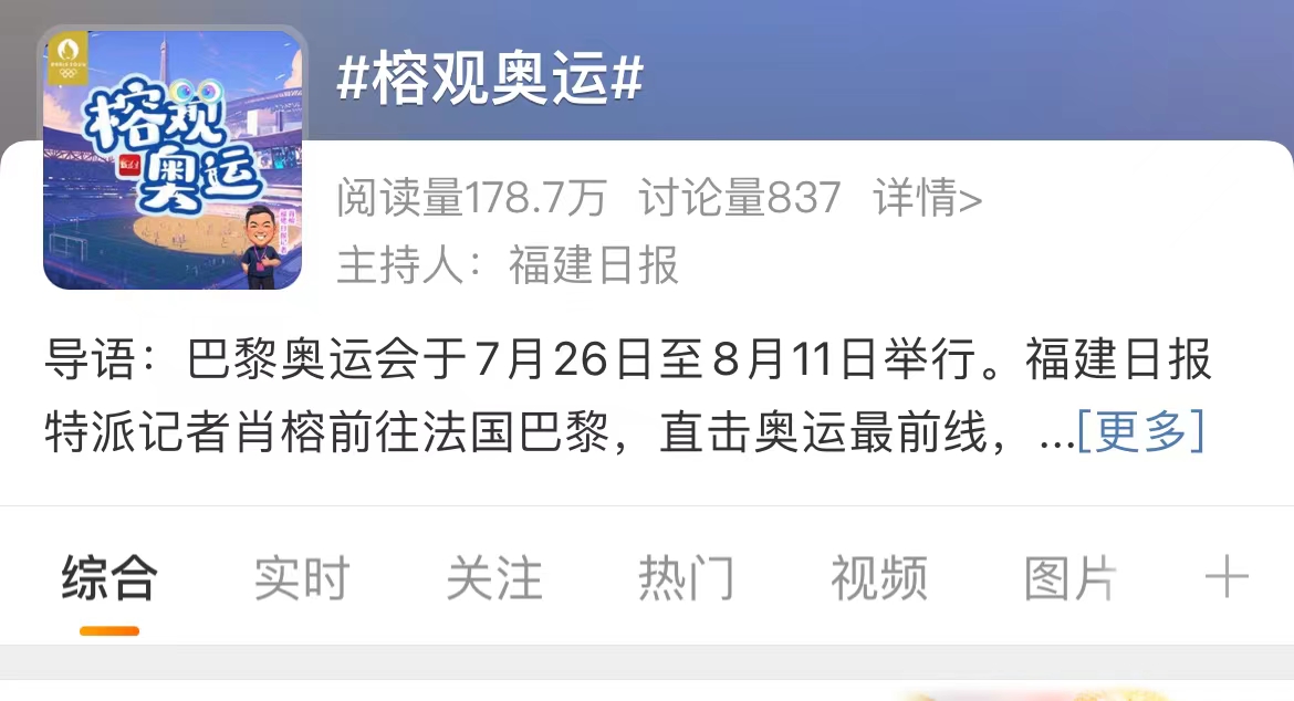 同時,福建日報微博還創(chuàng)建了#榕觀奧運# #閩將譚寧摘銀# #福建首金李發(fā)彬# 等原創(chuàng)話題,總閱讀量達280萬,總互動討論量超5000,在奧運會報道期間引發(fā)熱議。