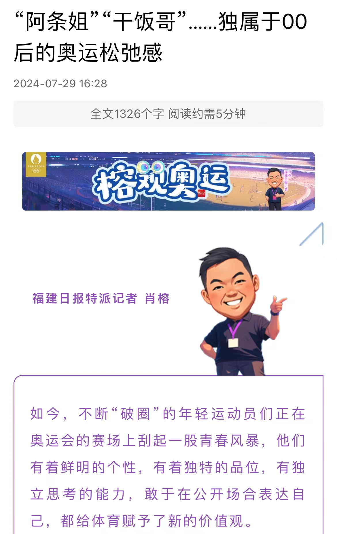 本次巴黎奧運會報道,新福建客戶端聯(lián)動福建日報特派記者肖榕,全程追蹤奧運會的精彩瞬間,通過圖文、視頻等多種媒體形式,共推出了94篇高水準原創(chuàng)報道,為讀者呈現(xiàn)了一場別開生面的巴黎奧運之旅。