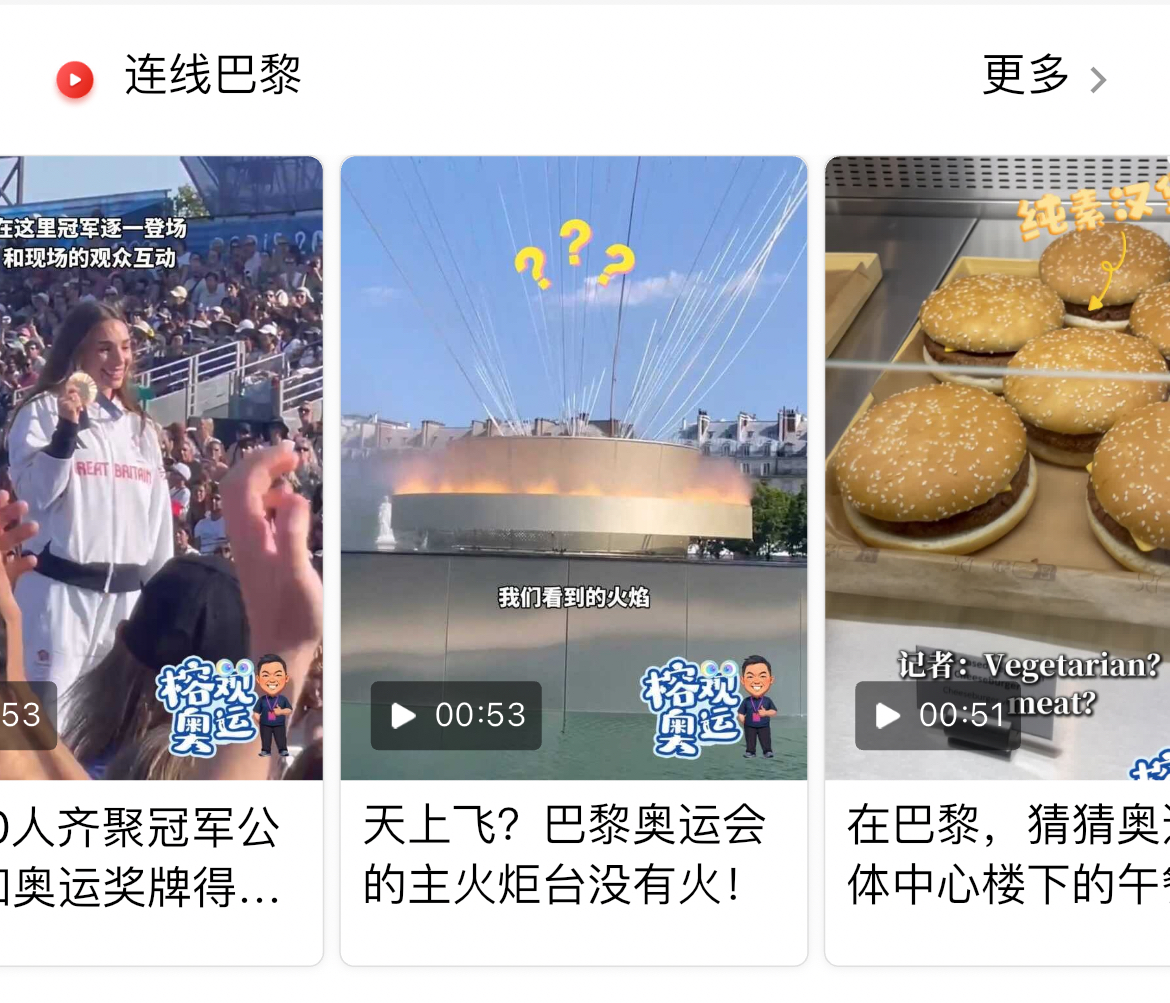 抖音、視頻號等第三方平臺的奧運相關視頻播放量突破2000萬,單條最高閱讀量達300萬余次,讓讀者沉浸式感受奧運。