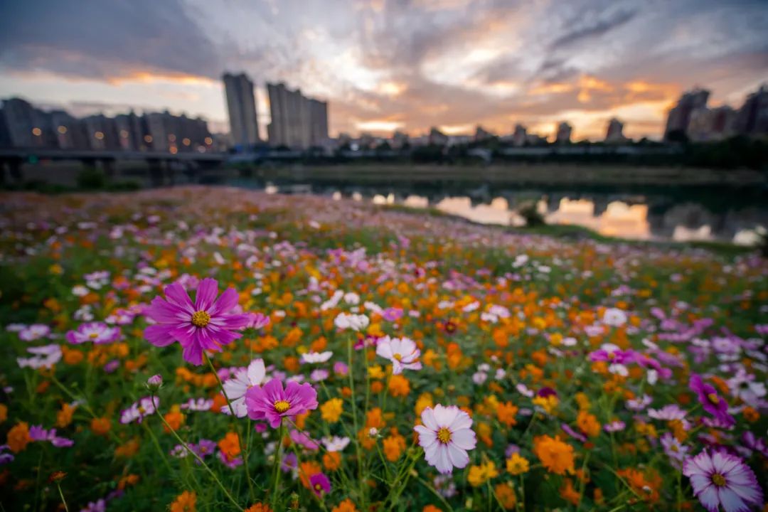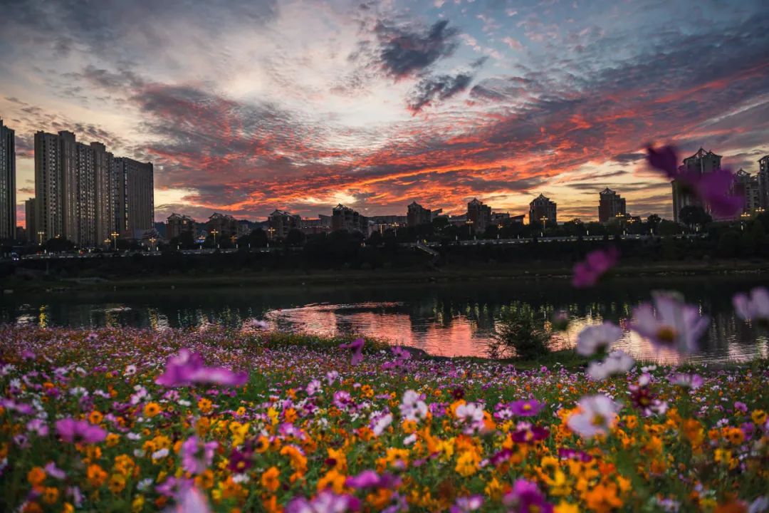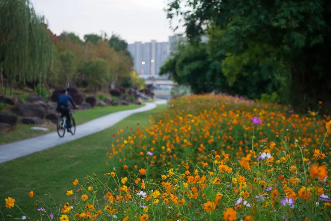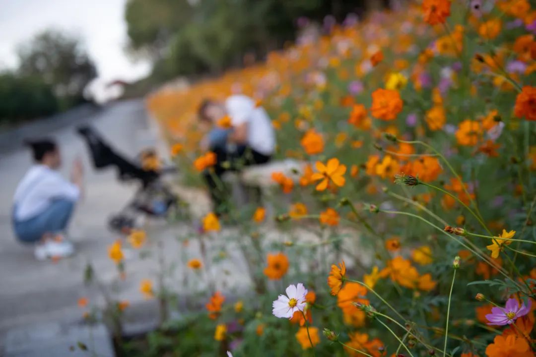 武夷新區(qū)崇陽北路濱江東路段,崇陽溪畔濱水步道旁的波斯菊、硫磺菊也迎來盛花期……