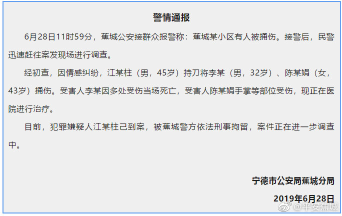 據(jù)福建寧德市公安局蕉城分局官方微博6月28日晚間通報,蕉城一名男子因情感糾紛將一男一女捅傷,受害男子因多處受傷當(dāng)場死亡。