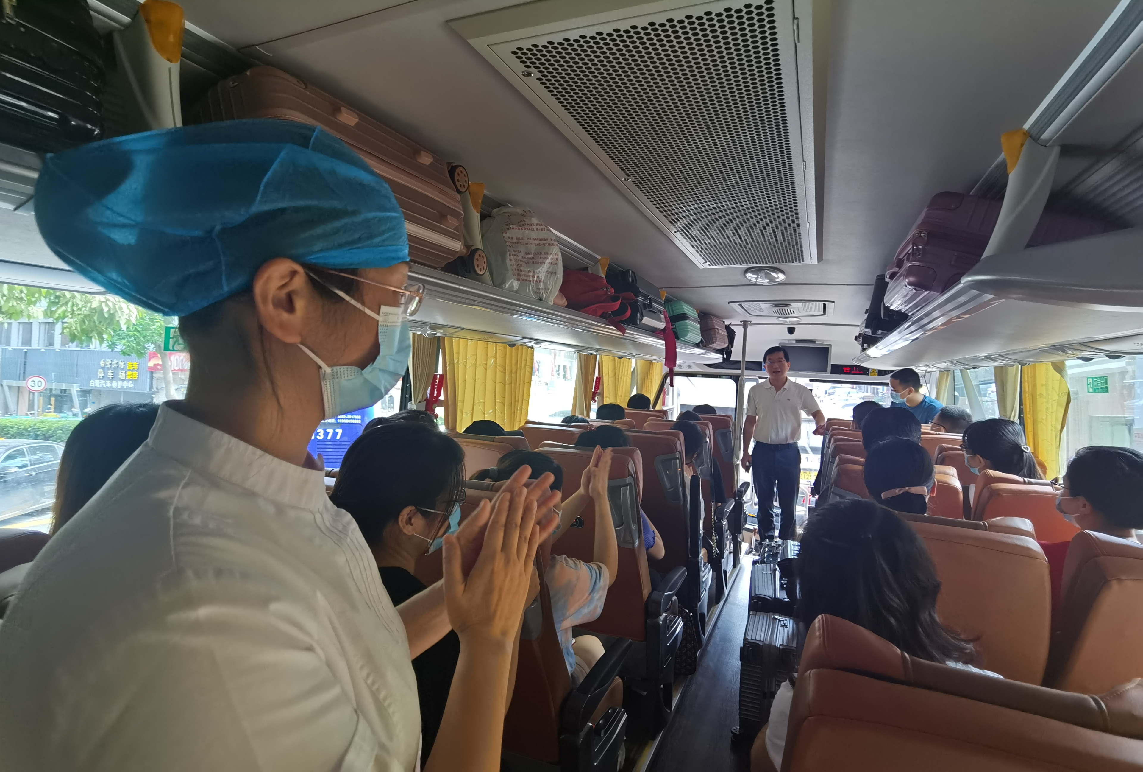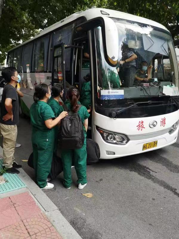 海滄醫(yī)院,在院領(lǐng)導(dǎo)的簡(jiǎn)短鼓勁和反復(fù)叮囑后,醫(yī)護(hù)人員們迅速登上大巴車……