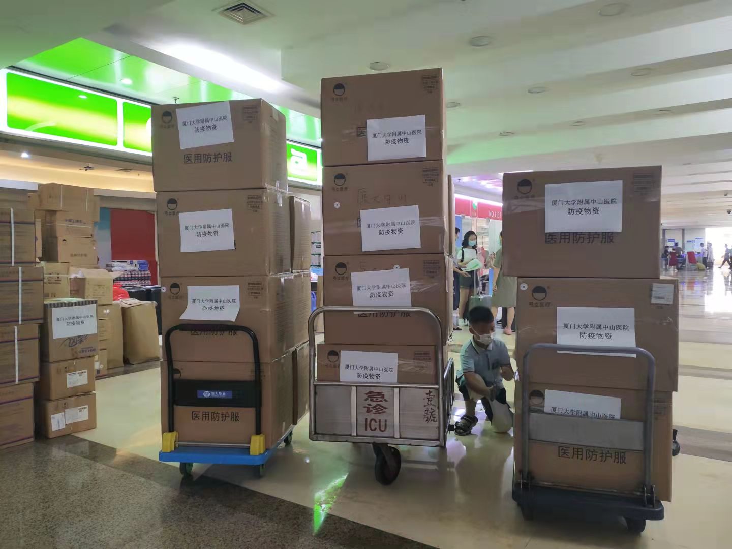 廈門大學(xué)附屬中山醫(yī)院內(nèi),多個(gè)職能科室工作人員連夜為出征的同事們打包了充足的物資,派出3輛車分5次才將隊(duì)員們和物資全部運(yùn)送到全市支援隊(duì)集合點(diǎn)。