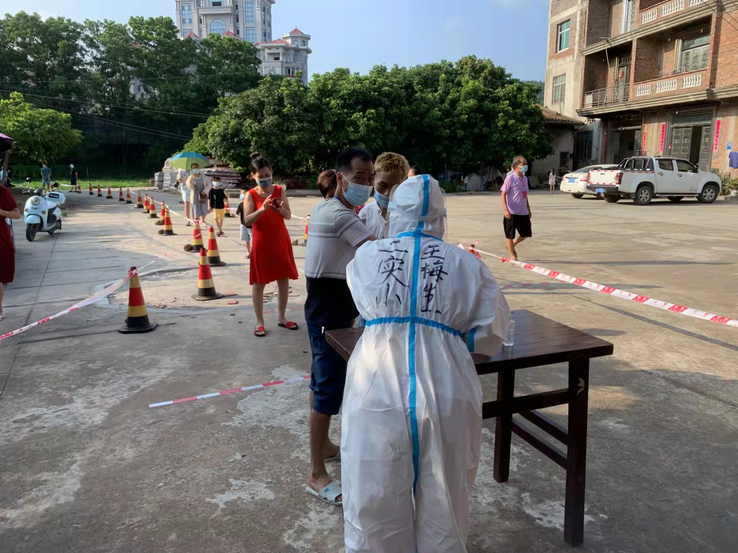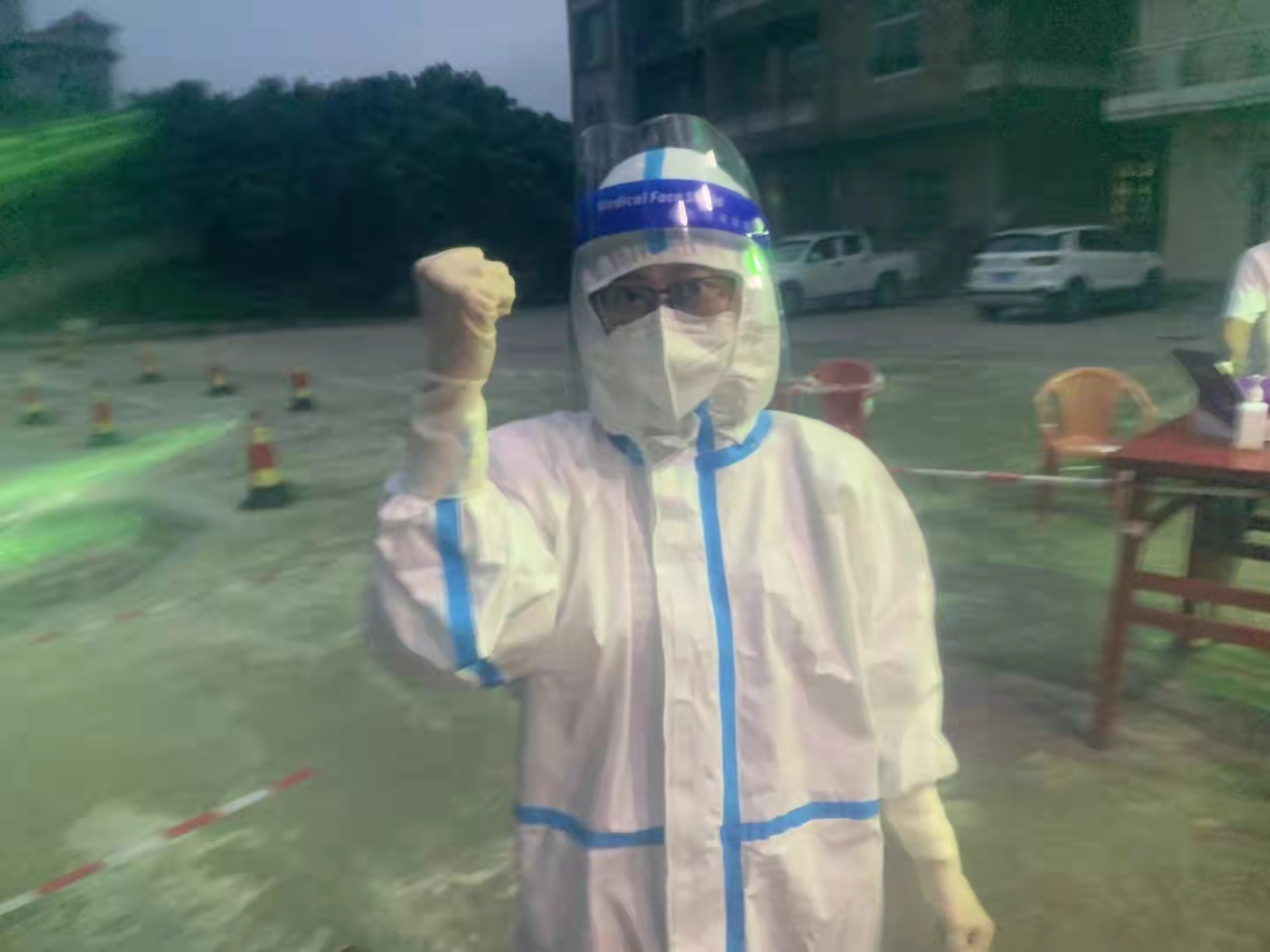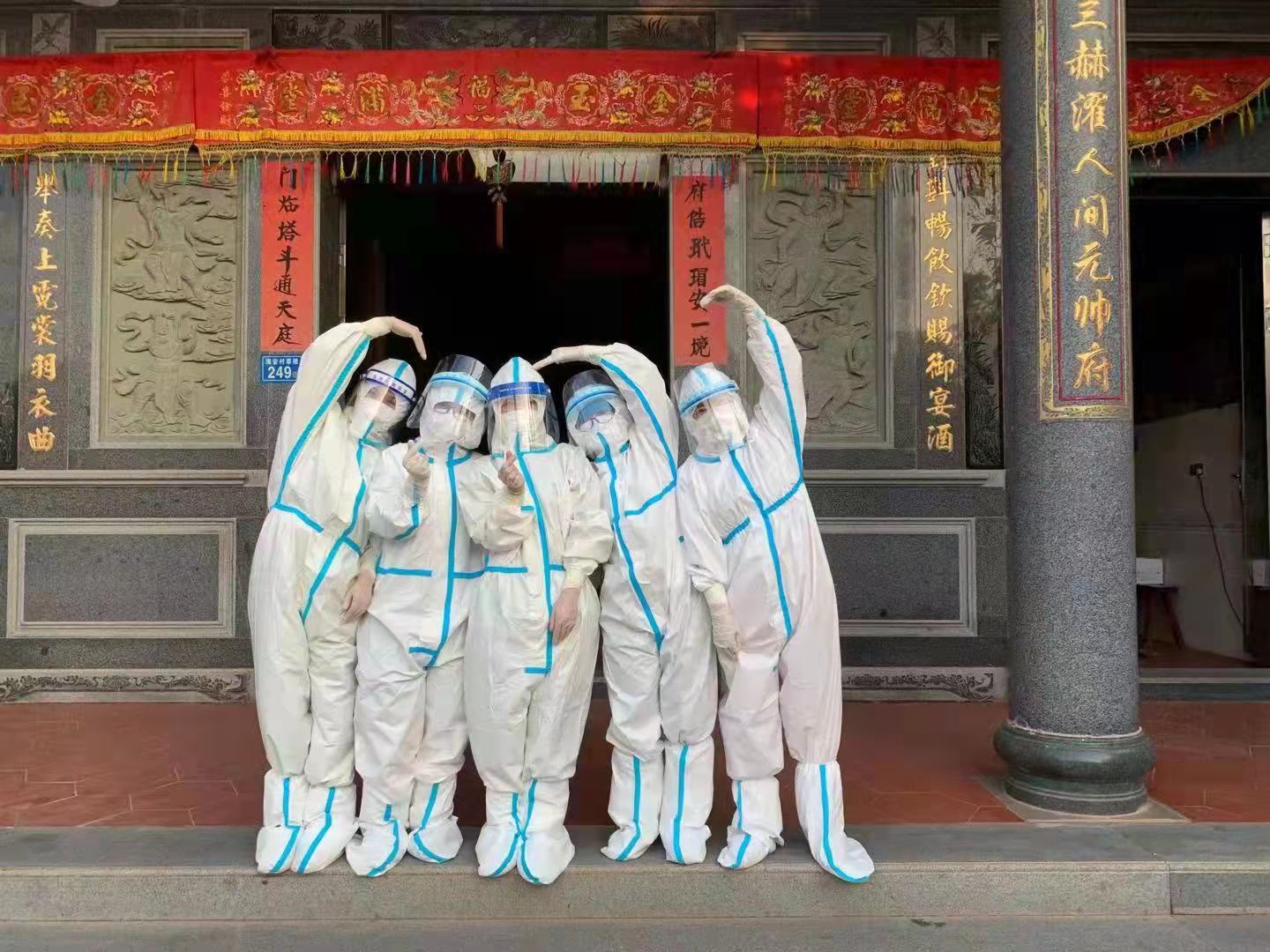 曾經(jīng)校園是這六位老師的主戰(zhàn)場,如今在這場沒有硝煙的“戰(zhàn)場”上,他們已然化身一位位英勇“斗士”,聽從指揮,服從命令,上到一線與病魔做激烈的較量。對于初來乍到的老師們來說,剛開始協(xié)助核酸檢測工作時,最大的困難就是不熟悉防護裝備的穿戴。為了盡快適應,駐扎海安村的寧德醫(yī)療隊醫(yī)生手把手為幾位老師進行了專業(yè)的講解。實驗小學的老師們在專業(yè)的指導下很快就克服了這第一道難關,工作也步入正軌。