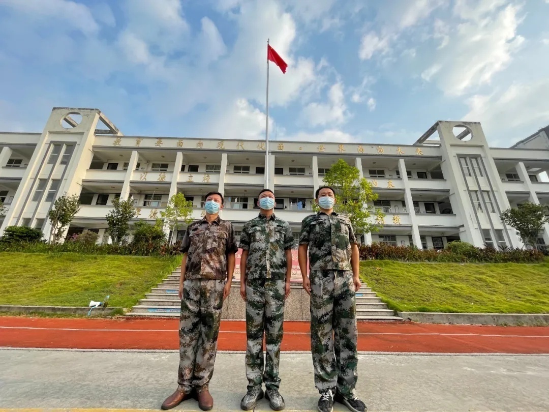 負(fù)責(zé)升國旗的是市文旅局駐村支援楓亭疫情防控黨員先鋒隊(duì)隊(duì)員陳懿琥和王俊冰、和建國村黨員志愿者蘇田,其中,陳懿琥是軍轉(zhuǎn)干部,王俊冰和蘇田都是退伍軍人。7時(shí)整,他們穿著統(tǒng)一的迷彩服裝,在莊嚴(yán)的國歌聲中,緩緩將五星紅旗升起。