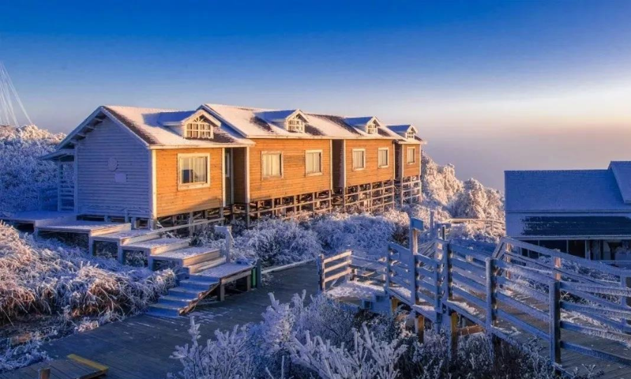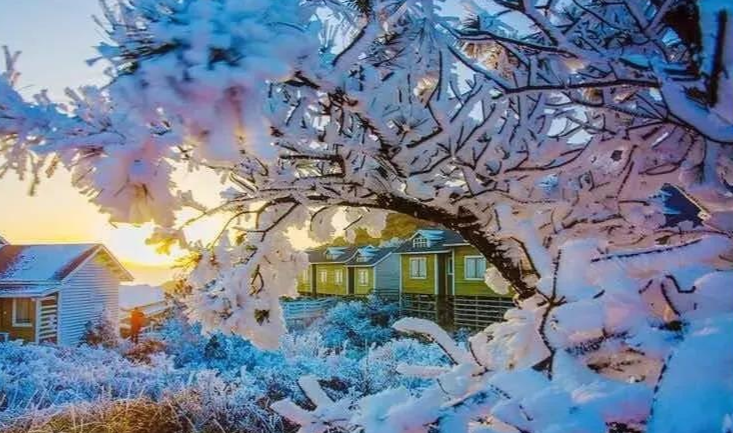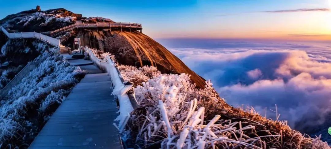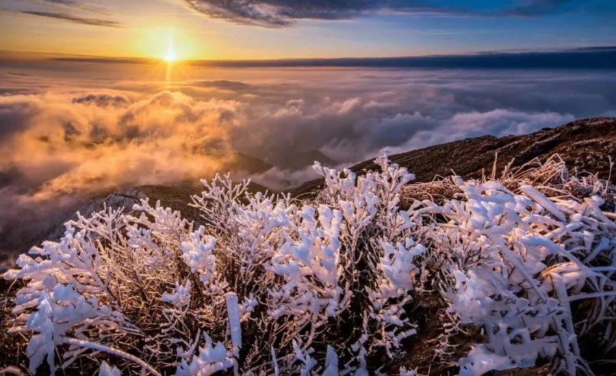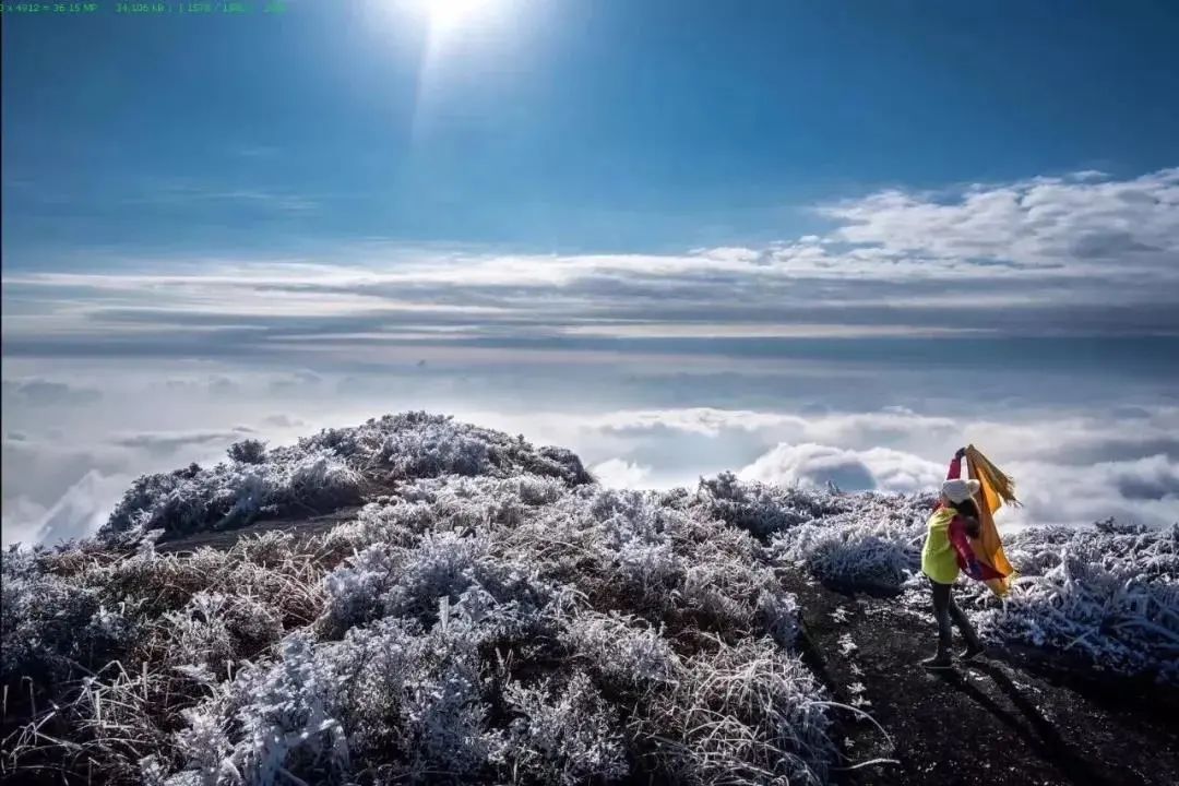 冬天的美麗來得總有點(diǎn)猝不及防,站山頂遠(yuǎn)眺群山,只見茫茫云海不見山。山間草木裹冰晶,仿若童話里那冰雪世界。