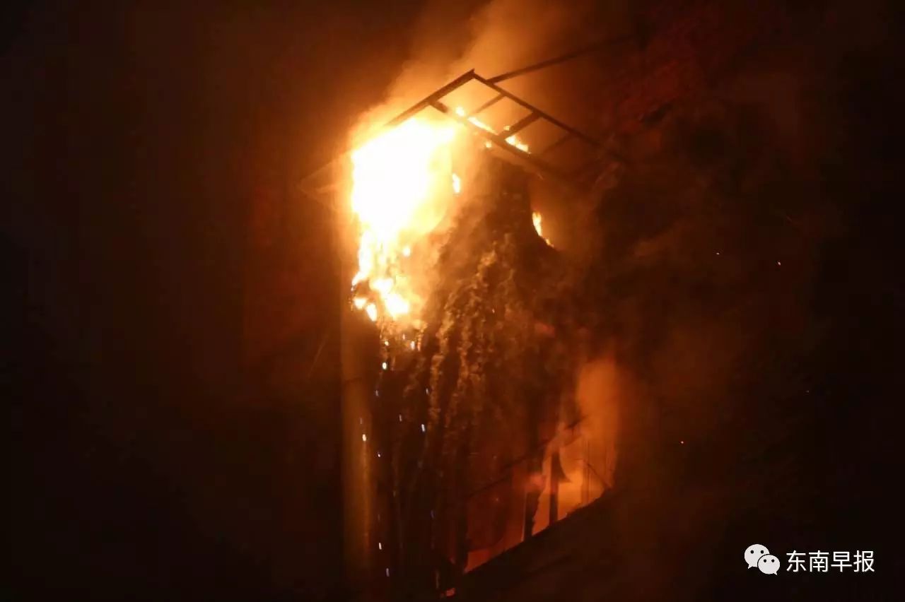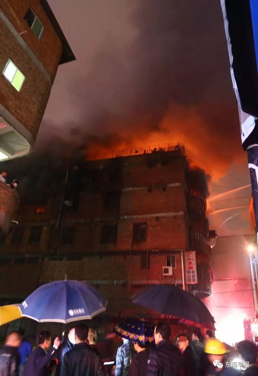 晚上10點多,記者趕到現(xiàn)場時,天正下著雨。起火的是一幢6層高的廠房,數(shù)百米外就聞到刺鼻濃煙,四樓以上外墻被熏黑。此時,六樓內(nèi)再燃起大火,火光沖出窗外,成型車間的風(fēng)管在雨中被燒得“噼里啪啦”直響。