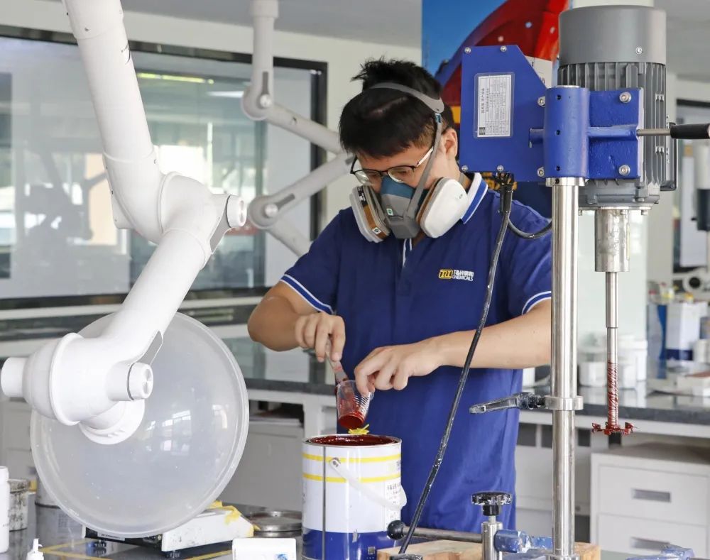 在信和新材料股份有限公司的新型環(huán)保型防腐涂料工程中心,科研人員們正戴著防護(hù)面罩,認(rèn)真細(xì)致地對(duì)涂料各方面性能進(jìn)行多維度測(cè)試。