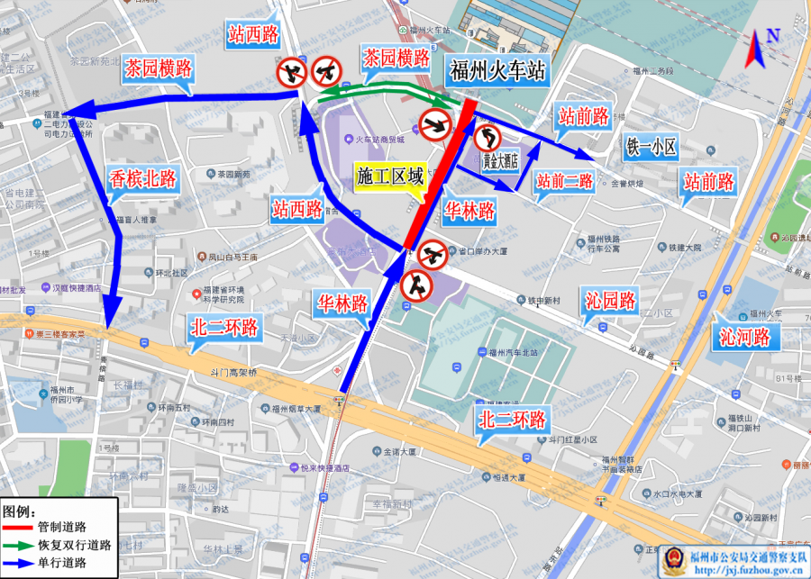 (二)站西路(南起華林路站西路口,北至站西路茶園橫路口)實行機動車由南往北單向通行。