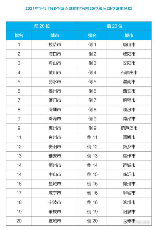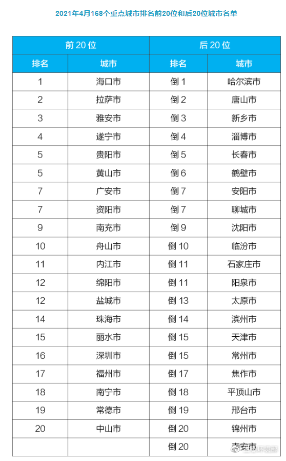 4月,168個重點城市中,哈爾濱、唐山和新鄉(xiāng)市等城市空氣質(zhì)量相對較差(從倒數(shù)第1名至并列倒數(shù)第20名);???、拉薩和雅安市等城市空氣質(zhì)量相對較好(從第1名至第20名)。