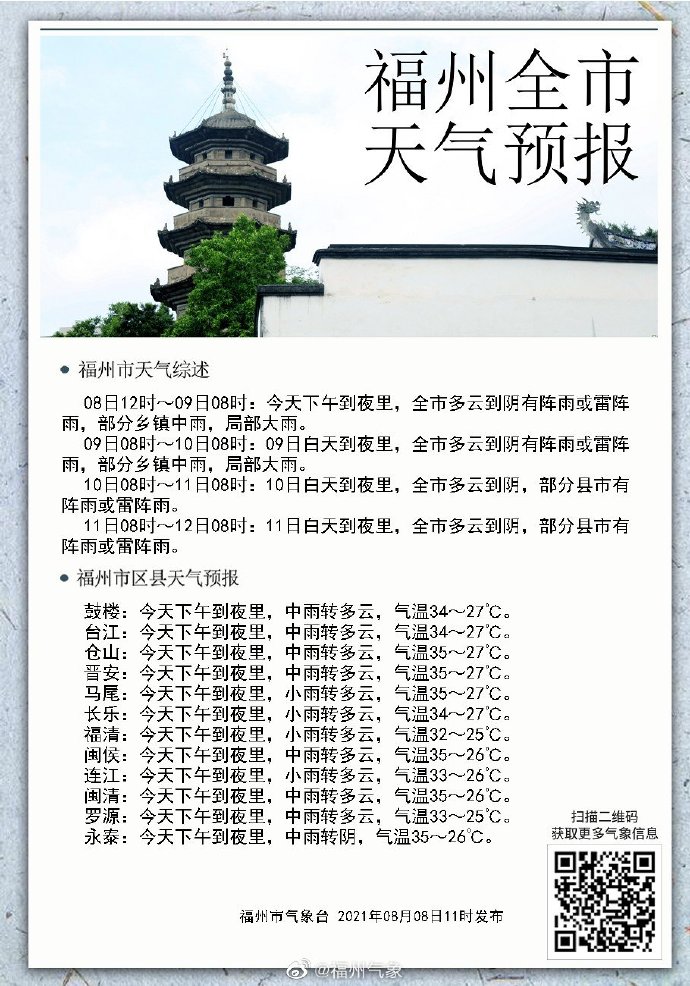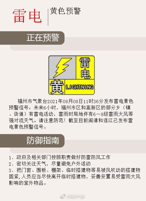 【福州市雷電黃色預警信號】福州市氣象臺8月8日11時36分發(fā)布雷電黃色預警信號:未來6小時,福州市區(qū)和高新區(qū)的部分鄉(xiāng)(鎮(zhèn)、街道)有雷電活動,雷雨時局地伴有6~8級雷雨大風等強對流天氣。請注意防范!截至目前閩清和連江已發(fā)布雷電黃色預警信號。