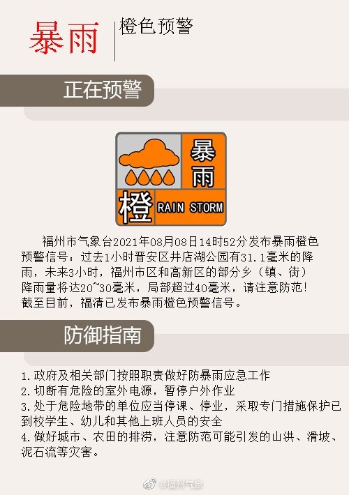 【福州市暴雨橙色預警信號】福州市氣象臺8月8日14時52分發(fā)布暴雨橙色預警信號:過去1小時晉安區(qū)井店湖公園有31.1毫米的降雨,未來3小時,福州市區(qū)和高新區(qū)的部分鄉(xiāng)(鎮(zhèn)、街)降雨量將達20~30毫米,局部超過40毫米,請注意防范!截至目前,福清已發(fā)布暴雨橙色預警信號。