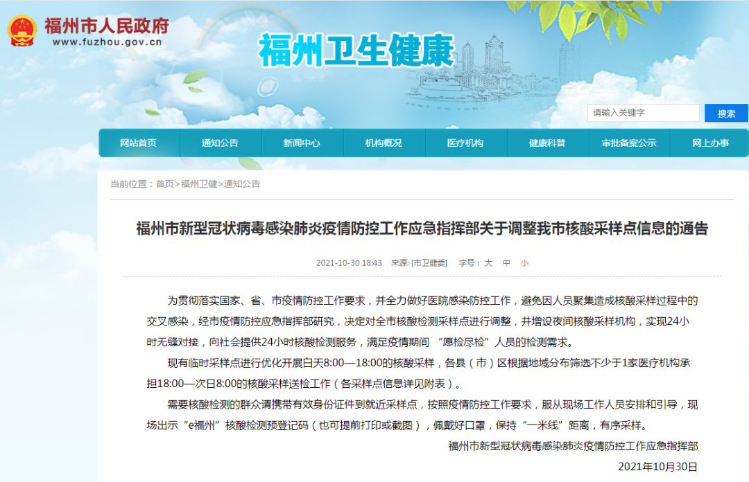 注意!福州發(fā)布通告,全市核酸檢測(cè)采樣點(diǎn)有調(diào)整,新增24小時(shí)核酸采樣點(diǎn),增設(shè)夜間核酸采樣機(jī)構(gòu)。