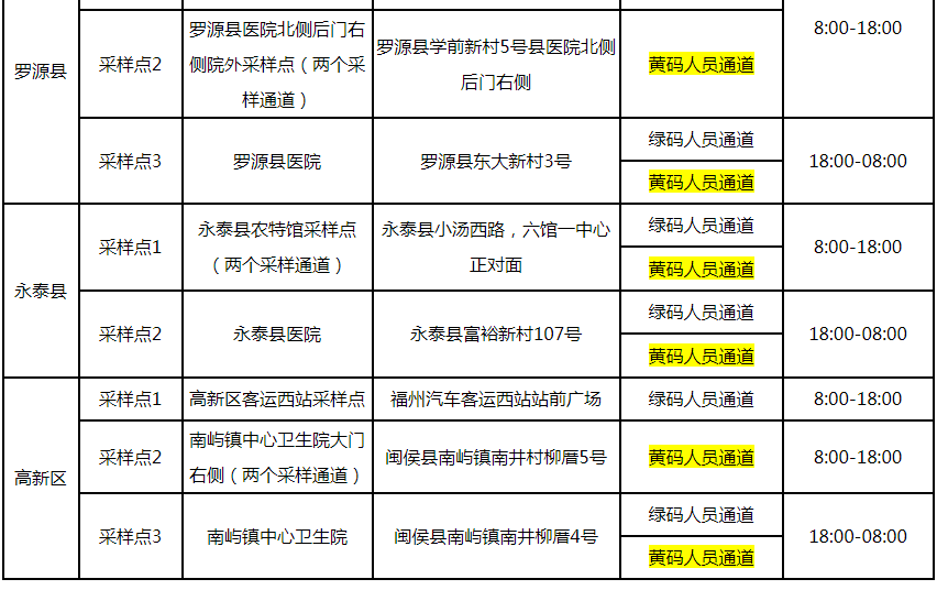 現(xiàn)有臨時(shí)采樣點(diǎn)進(jìn)行優(yōu)化開(kāi)展白天8:00—18:00的核酸采樣,各縣(市)區(qū)根據(jù)地域分布篩選不少于1家醫(yī)療機(jī)構(gòu)承擔(dān)18:00—次日8:00的核酸采樣送檢工作(各采樣點(diǎn)信息詳見(jiàn)附表)。