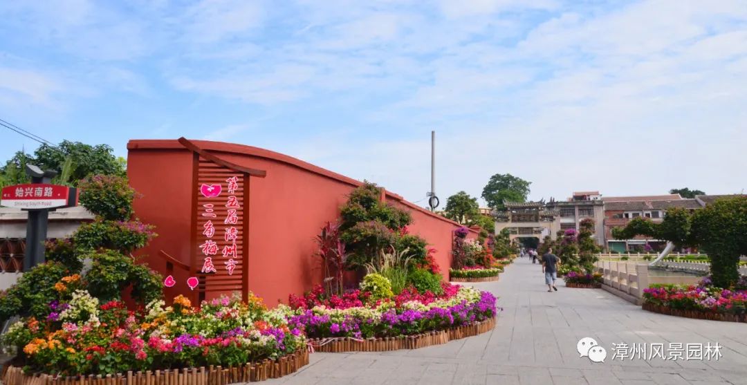 以三角梅樁景為主景,配置綠植,結(jié)合擺件,圍合成飄帶造型,打造成一條絢麗多姿的花路。