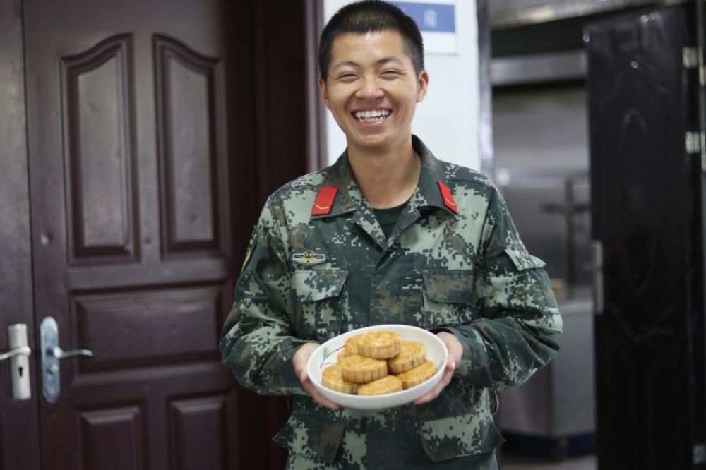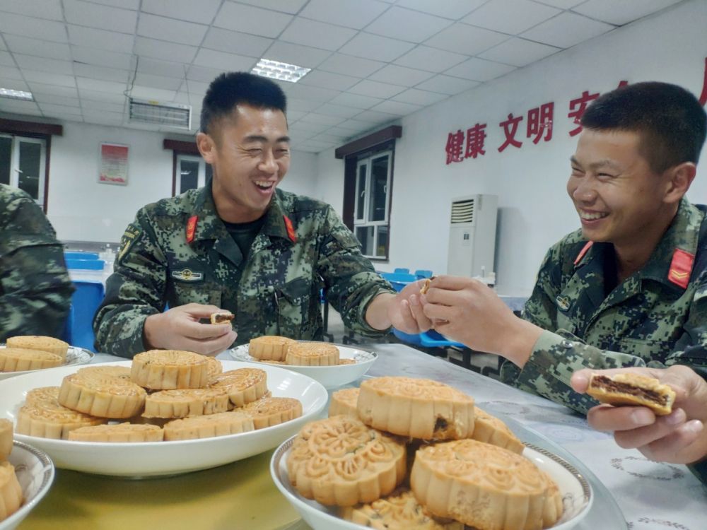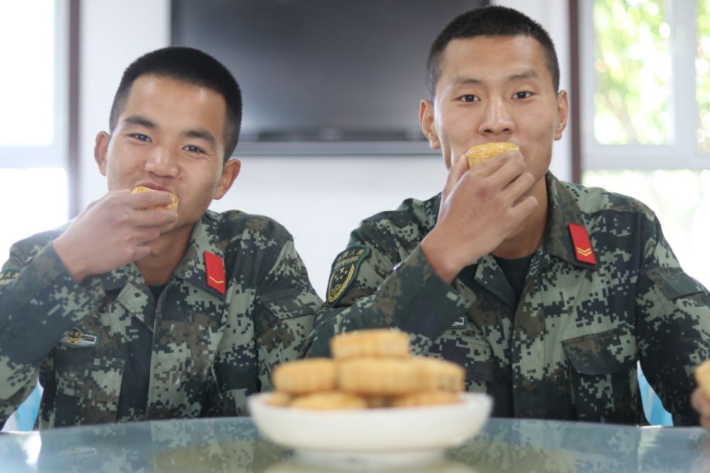 ↑戰(zhàn)士們一起分享著美味的月餅。