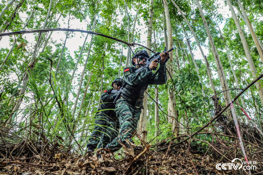 特戰(zhàn)隊(duì)員快速跨越溝壑。(劉明 陳俊成 潘懿豪)