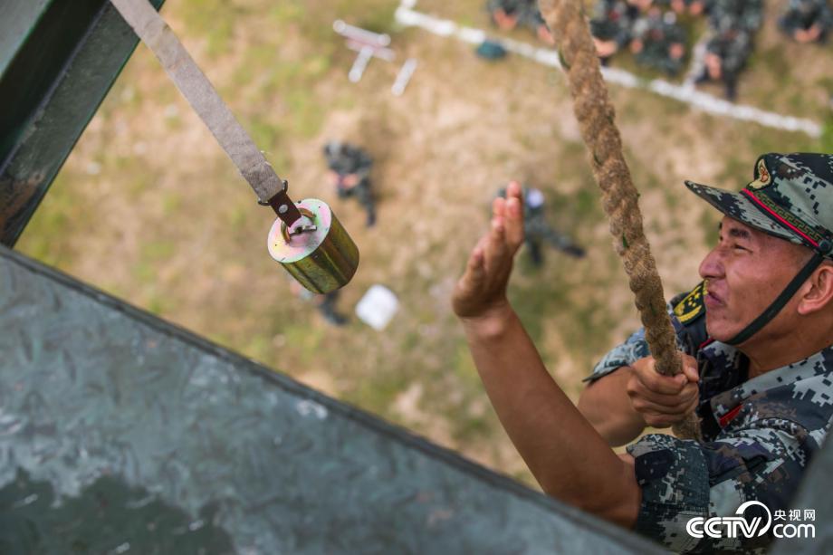 參賽官兵抓繩攀登觸碰鈴鐺。(果志遠(yuǎn))