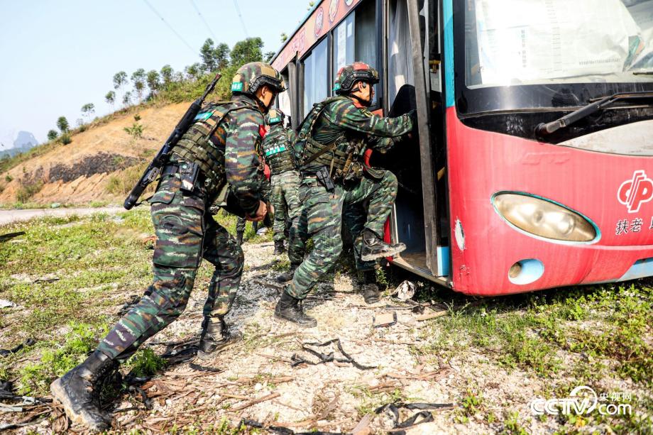 武警特戰(zhàn)隊員開展公交車反劫持演練。